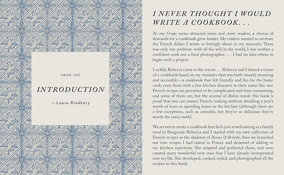 Bisous & Brioche features classics like vinaigrettes, madeleines, crêpes, crème fraîche, tarts, cassoulet, coq au vin—dishes whose names alone will warm the heart of any Francophile. The recipes are served up with anecdotes about their arrival in Laura’s life and are accompanied by Rebecca’s sun-soaked photos of market visits, meal prep, and lazy lunches in the vineyard.